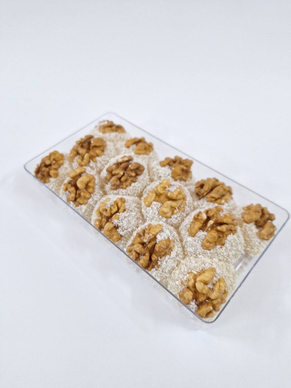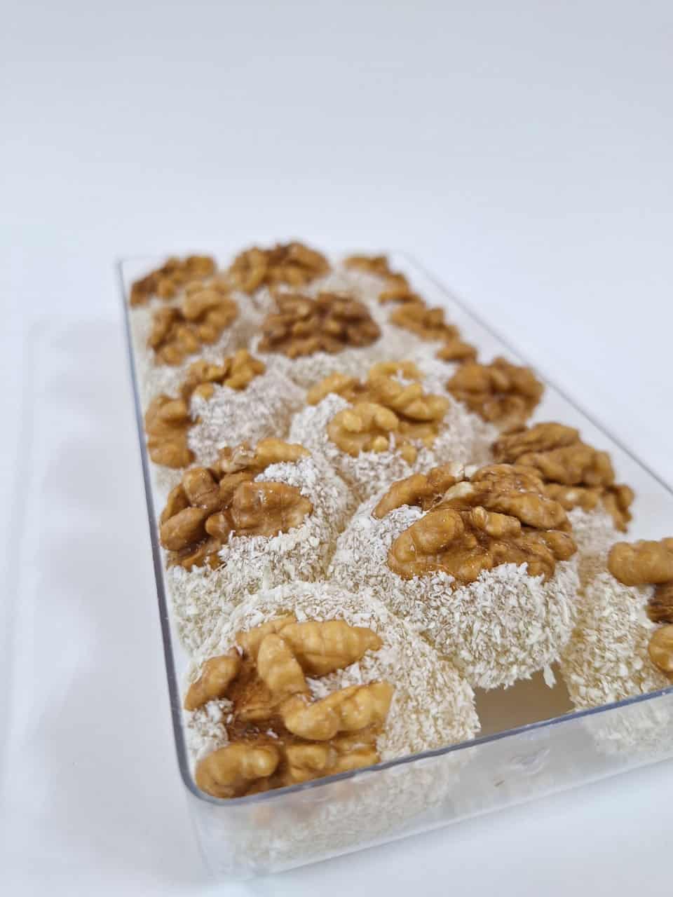 مواد اولیه: شکر ، نشاسته، آب،اسید سیتریک، نارگیل ، طعم های طبیعی و مغز گردو