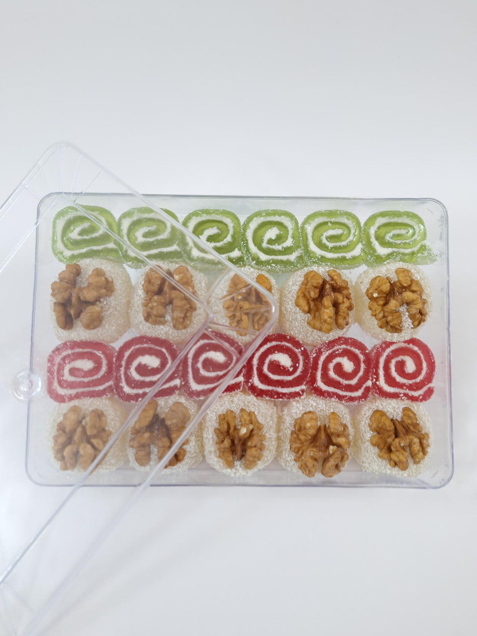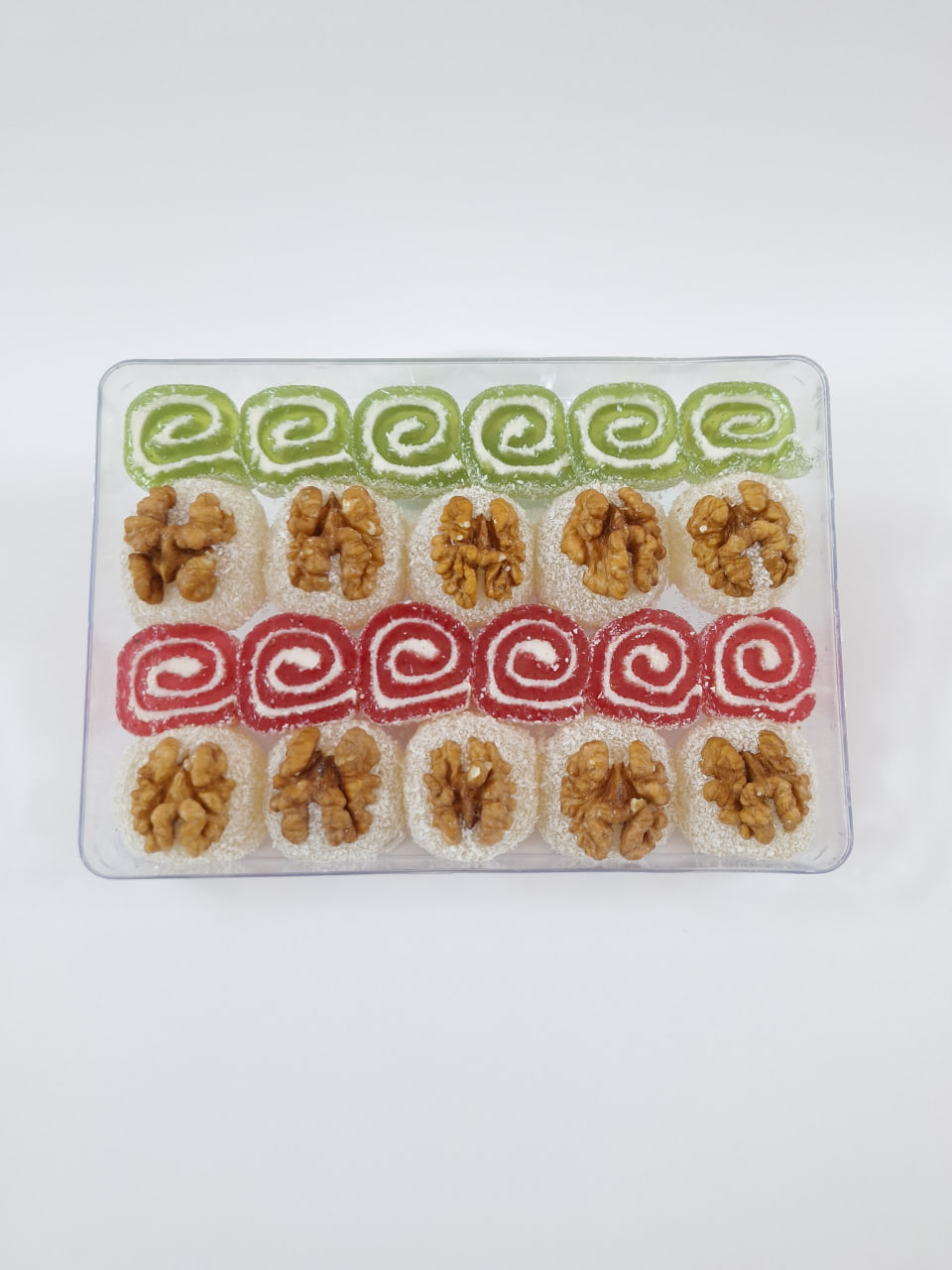 مواد اولیه: شکر، اب، نشاسته، اسید سیتریک، نارگیل، طعم دهنده های طبیعی، رنگ های طبیعی، مغز گردو